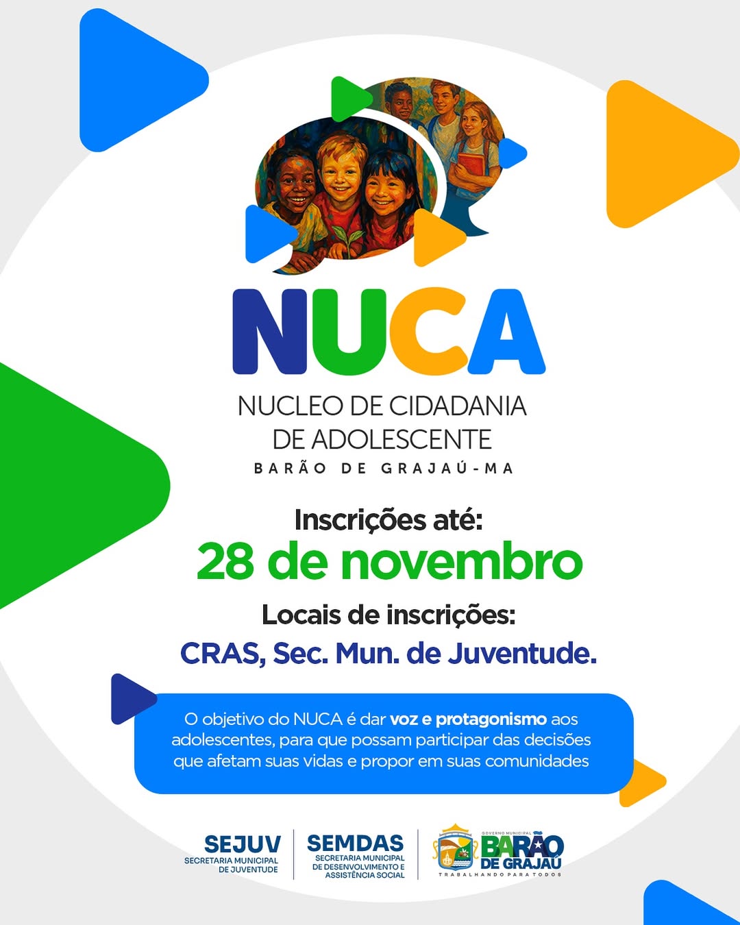 A Prefeitura de Barão de Grajaú anuncia que estão abertas as inscrições para o Núcleo de Cidadania de Adolescentes (NUCA), um espaço dedicado ao protagonismo juvenil e à formação de jovens conscientes e participativos. O programa busca incentivar a expressão, o diálogo e o desenvolvimento social entre os adolescentes do município.
